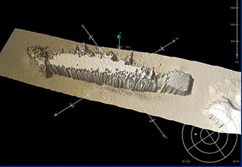 A large modern vessel was clearly discernible in the multibeam data near the small promontory fronting Orsos Bay upon initial examination. The dimensions and observable configuration of this modern vessel is consistent with a large freighter. A likely candidate for the identification of this wrecksite is the Italian freighter Rosandra that was torpedoed by British forces on June 14, 1943.