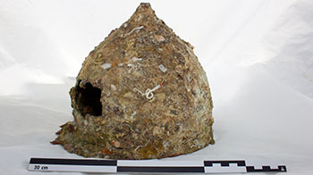During ROV operations thirteen bronze helmets were located on the seafloor. Seven of these are in a rather concentrated area of c. 25 m2; the other helmet was found in the rocks c. 200 m to the SW and relatively close to the find location of the Egadi 6 ram. The helmets were in varying degrees of condition, most having sections missing due to corrosion and possibly post-depositional impacts as the metal is thin. Four of the collected helmets were of the same type as three discernible helmets left on the seafloor: Montefortino. This is a type of helmet common to the 3rd century BCE with Celtic origins. As the Romans had adopted this helmet by this period and the Carthaginians hired Celtic mercenaries, it is thus far difficult to assign a cultural affiliation based solely on their style.
