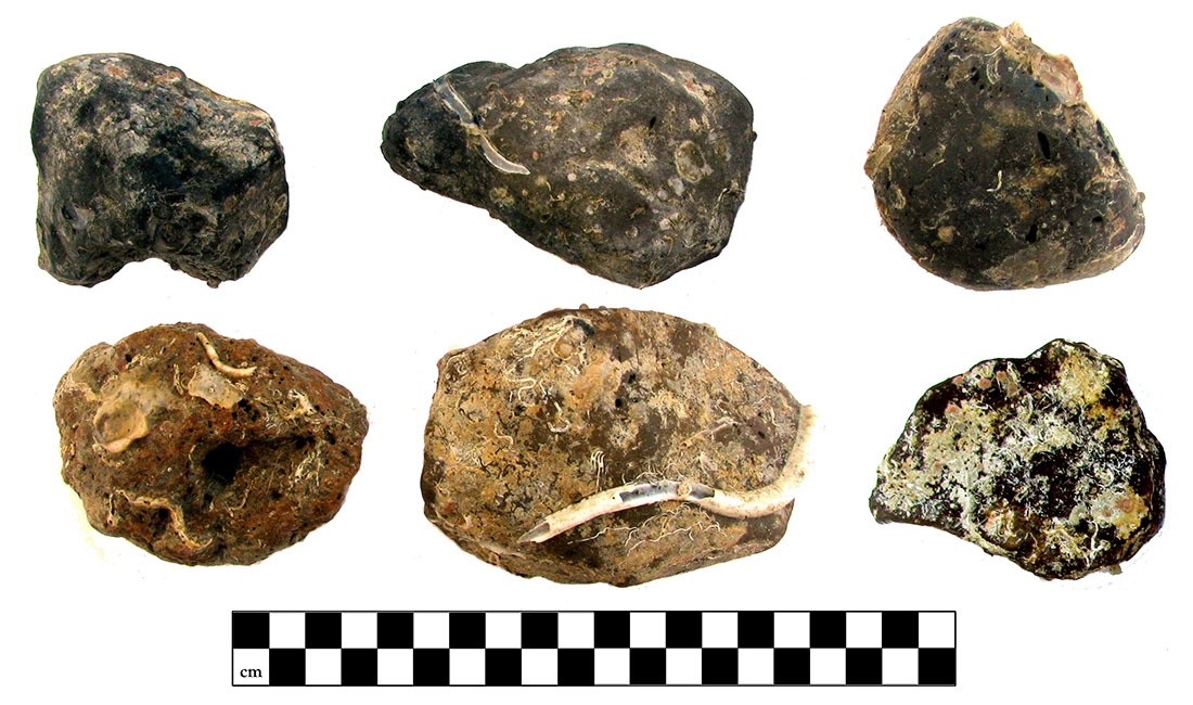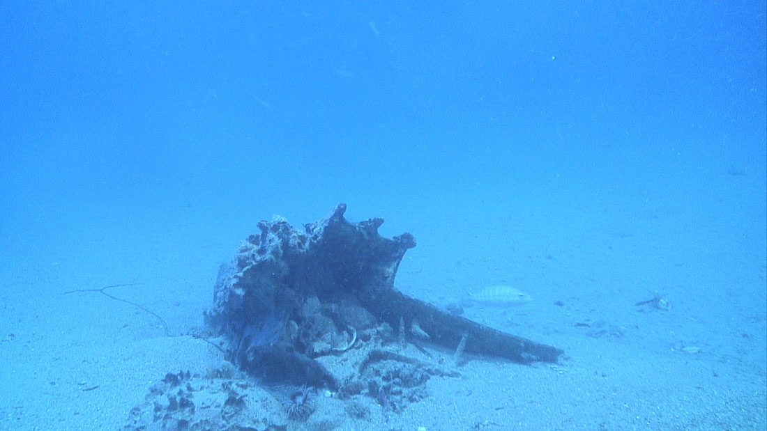 The Egadi 4 ram was recovered in 2011 in sector PW-A at an approximate depth of 80m. The ram as discovered inverted within a slight depression sitting above an intact, half-buried Greco-Italic amophora. Excavation in the close proximity revealed fist-sized stones, two of which were raised for analysis; 6 additional stones were found within the ram’s cavity. These smooth stones appear intrusive to the region and are of sizes consistent with ballast stones. Three tile fragments, a pottery sherd and an iron nail concretion from the hull were also found within the cavity; being most likely representative of the nesting habits of the local octopus. A small section of the keel was preserved in the forward section of the bottom plate.