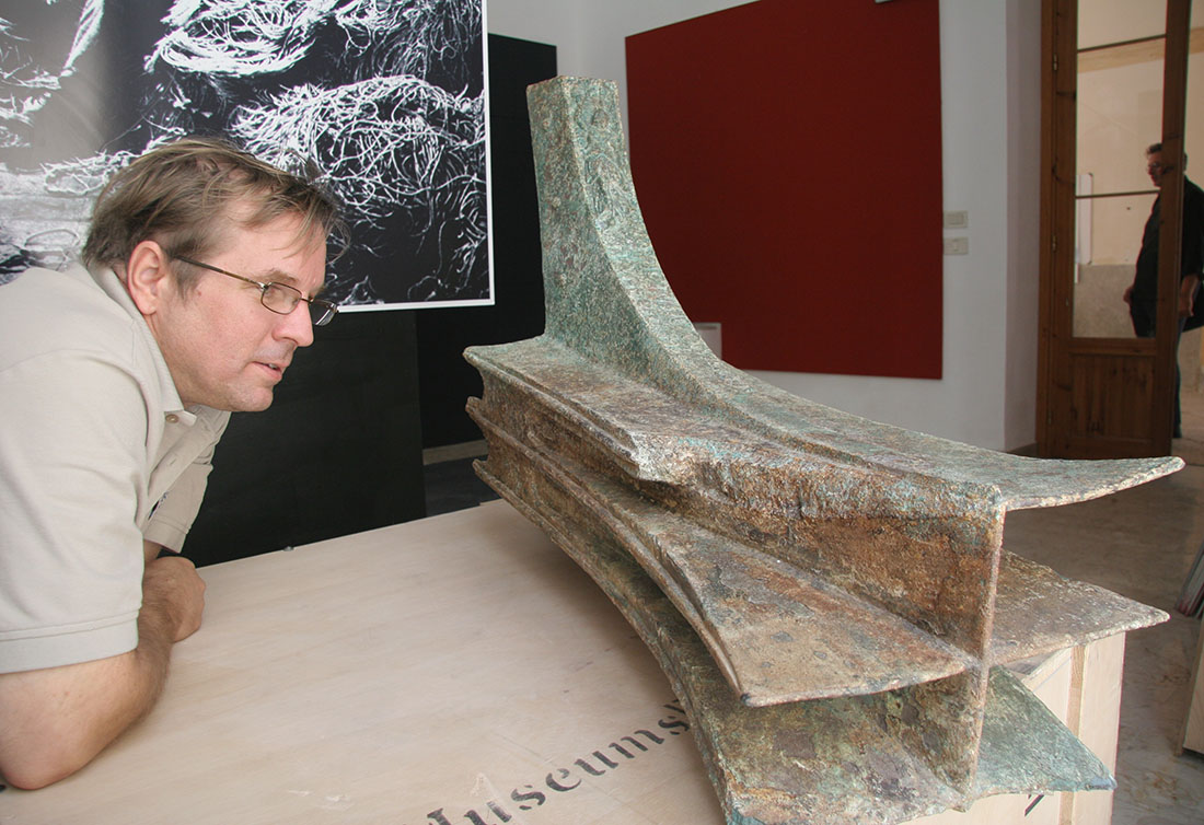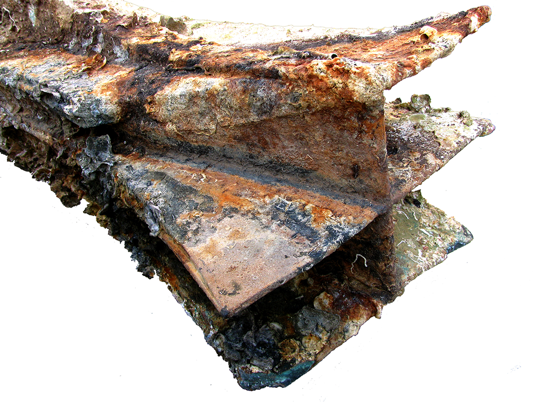 The primary damage to the ram was the missing front corner portion on the starboard side of the upper fin; corrosion and marine growth indicated an old break. The straight angle of the break without any associated deformation indicates the corner was cleaved off by direct impact to the head. This kind of sheer break would necessitate a considerable concentrated force such as one occurring in a ram-to-ram collision in which only the top fin of the starboard side bore the initial hit. The port side of the upper fin is deformed upwards, a possible result of contact later in the impact event. This is the second longest ram overall with asymmetrical shape and a significant amount of head flare. A molded decoration and inscription was located on the cowl nosing. All the bronze attachments on the cowl and driving center were preserved to some degree, extending as they do into the interior of the ram. This preservation suggests that the ram must have been deposited on the sea-floor while attached to bow timbers. Remains of wood within the starboard wale pocket and bottom place are also preserved due to the leaching of copper.