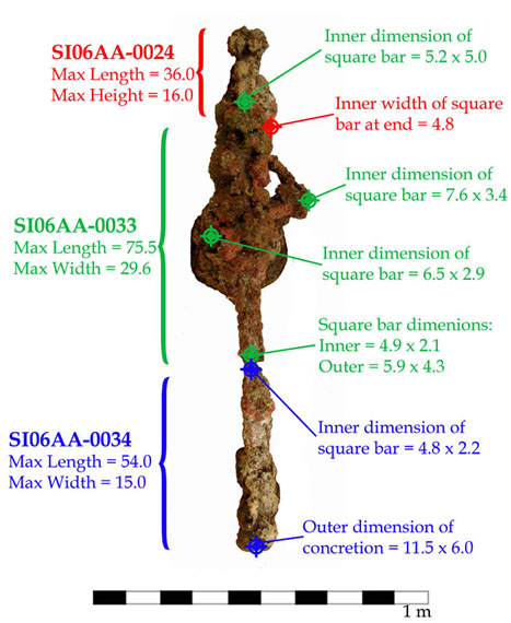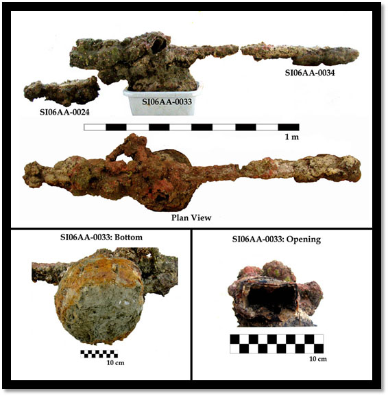 A large concretion found is comprised of at least two iron bars, square in cross section, with a large ball attached about midway along its length. The most horizontally linear bar appears nearly intact, whereas another bar crossing this one appears to have lost part of its length that would have extended upwards. There appears to be wood included within this concretion, particularly the majority of concretion SI06AA-0024. A nail hole (0.7 square) and a large bolt head (2.5 high, 3.2 diameter) in the upper portion of this concretion confirms the presence of a large timber. This nail hole is consistent in shape and dimension to those nails found on the site.